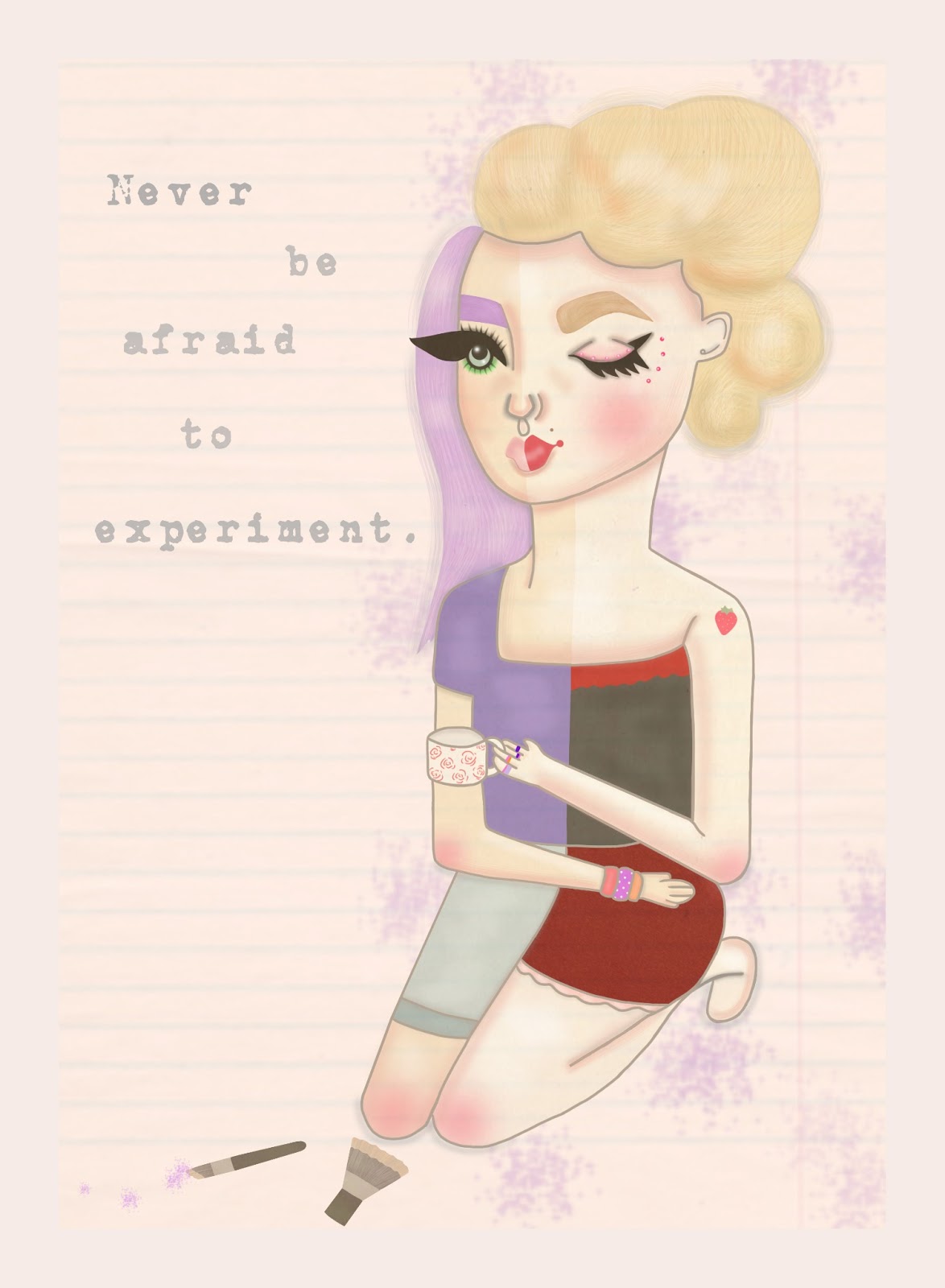 Here is my latest illustration for Karla's 'Tales of Creativity' charity project. I thought of the little tagline for this one, and I wanted to try and create a fun image which reminds us that sometimes we need to experiment to produce our best work - even if it turns out to be a little crazy or weird. I think sometimes we all fall into the trap of feeling the need to fit in with what everyone else is doing, this goes for blogging as well. It's definitely getting harder to be original these days with so many awesome and inspiring blogs around. So yes, what I'm basically trying to say is don't be afraid to do something a little different; maybe some people won't really 'get it' or like it, but it can also really help you to stand out. Karla said something very similar in a recent email, paraphrasing she said 'thinking outside the box helps to get your work noticed' and I do think that's absolutely true.