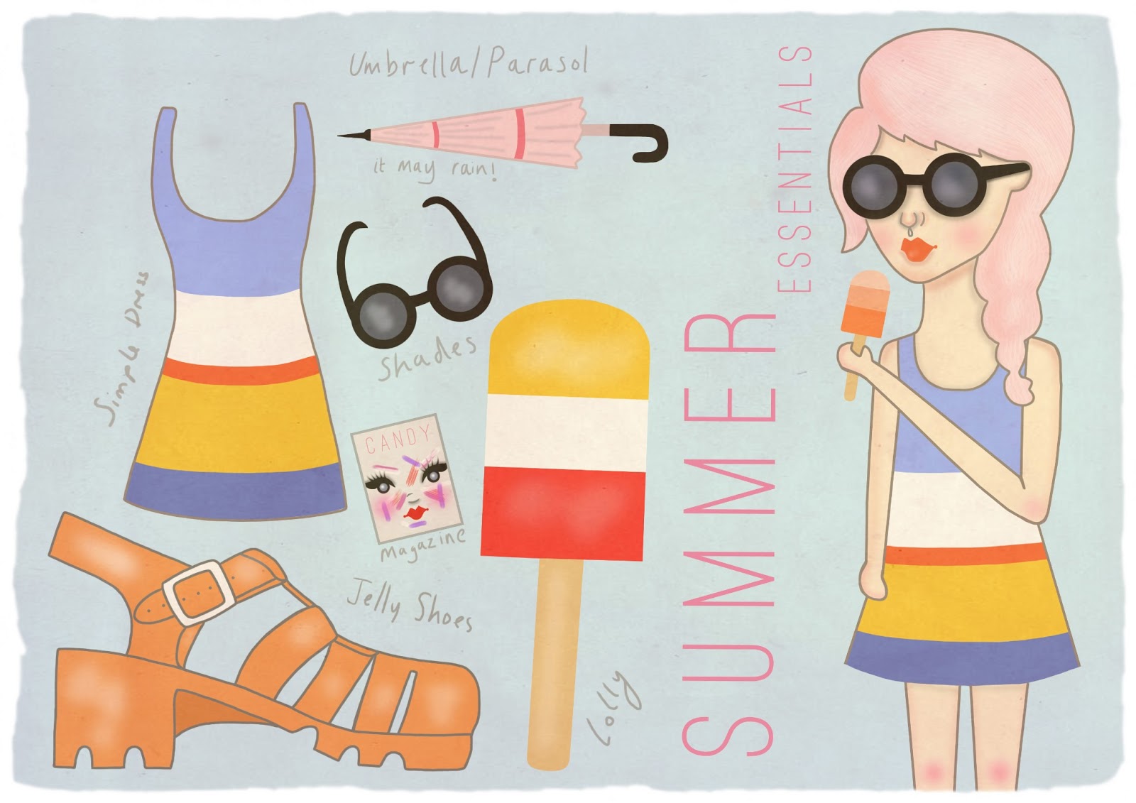 Well, it seems that we have had a few rare glimpses of sunshine over the last few days so it seemed appropriate to make this little illustration! If you've followed for a little while, you may be aware that I LOVE Juju jelly shoes. I know they might be seen as a little childish, but they are so darn cute. Anyway, it seems Juju have released a ton of new, amazing shades for this summer, so be sure to keep your eyes peeled for them. Everything else in this illustration is pretty standard really - I'm sure most people love a tasty ice lollipop on a hot day! Although if you are going to the shop, be sure to bring a cornetto home for me.